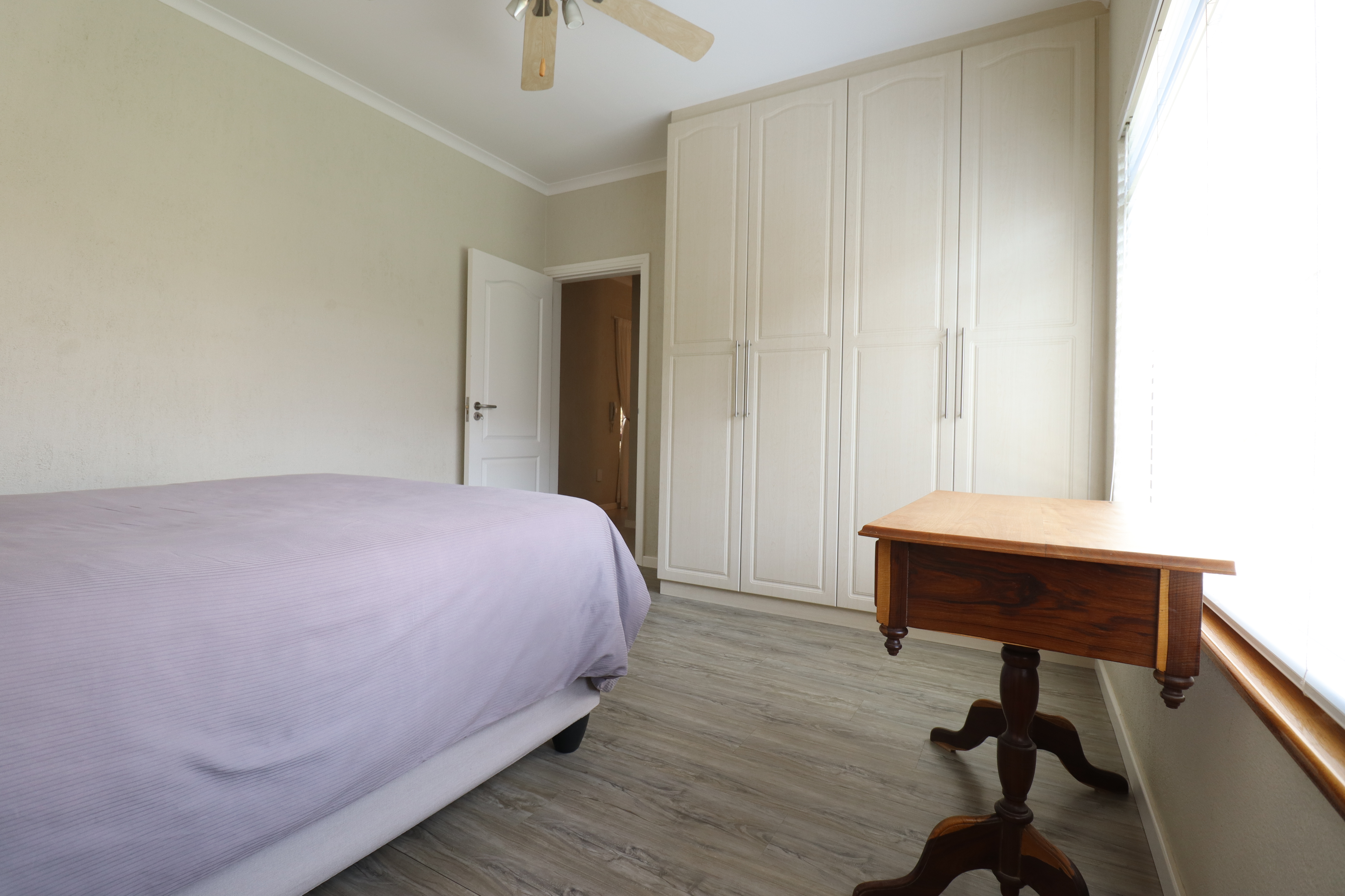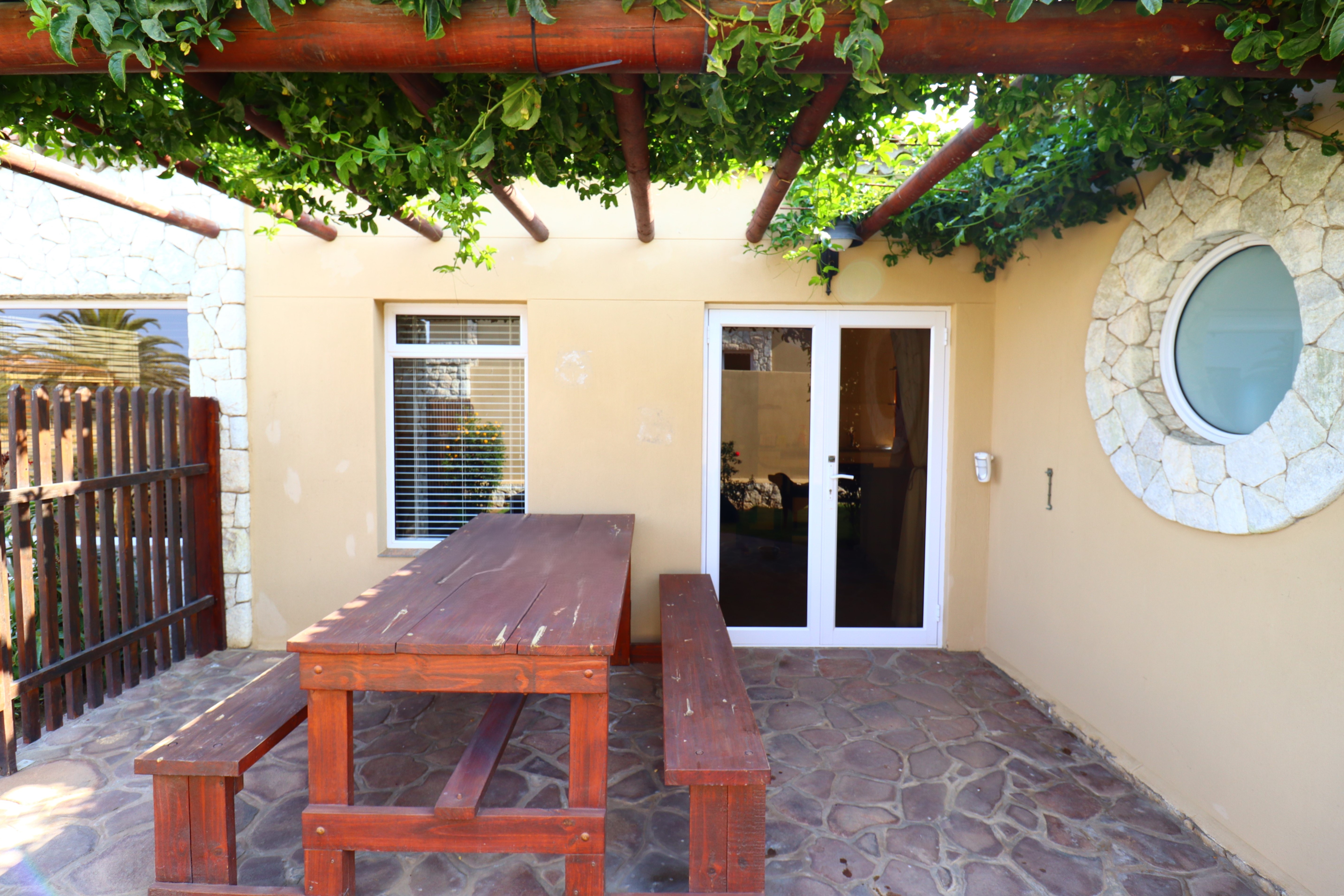This separate flat, with its own entrance, includes two bedrooms—one spacious—both with built-in cupboards sharing a bathroom. The lounge integrates with a fully fitted kitchen and opens to a private garden and patio, as well as the inner garden court.