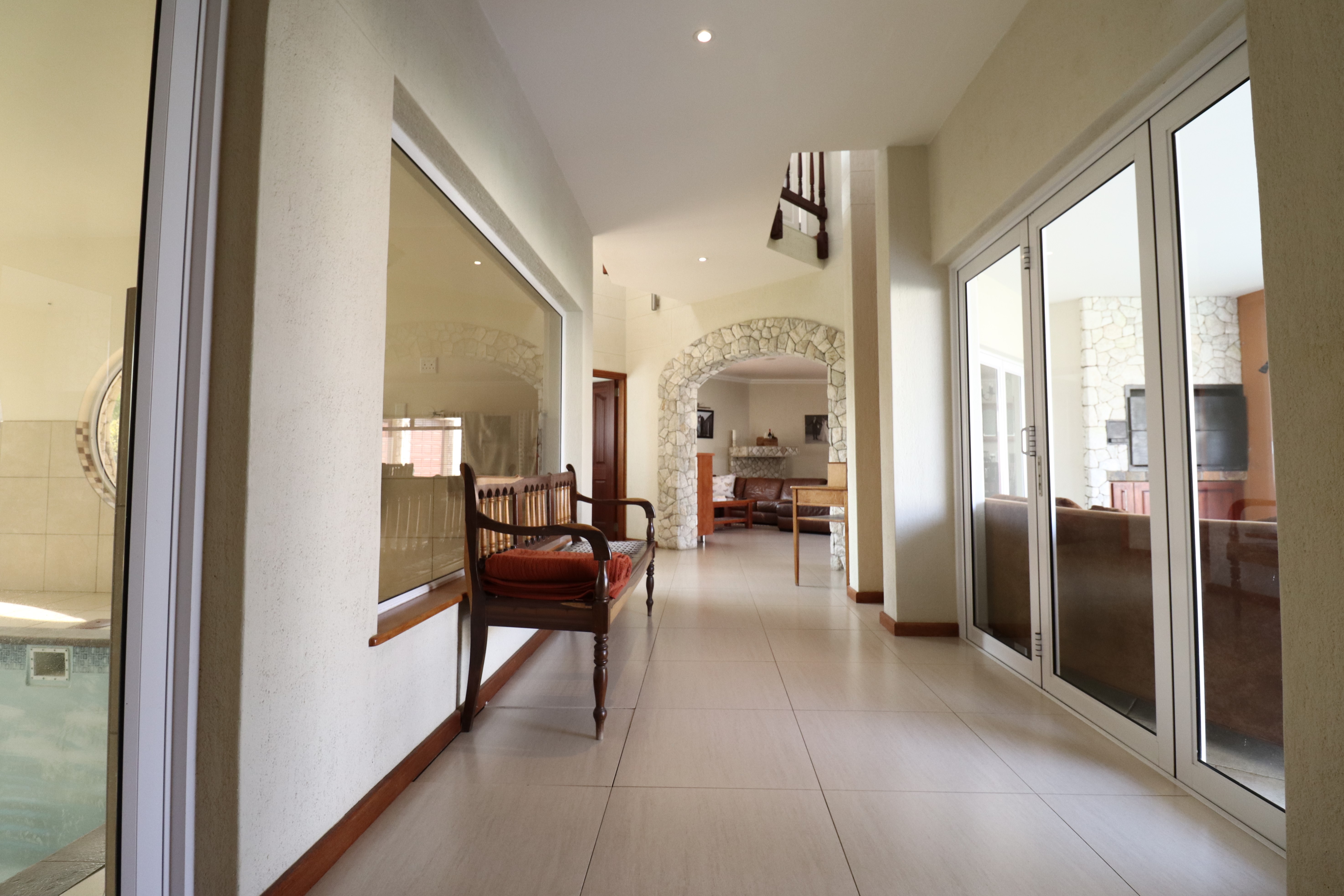 The cozy front patio connects directly to the main entrance, leading into a welcoming reception area that divides the indoor swimming pool from the family rooms in the living area downstairs. Glass doors open from this space to the garden patio, creating a seamless indoor-outdoor flow.