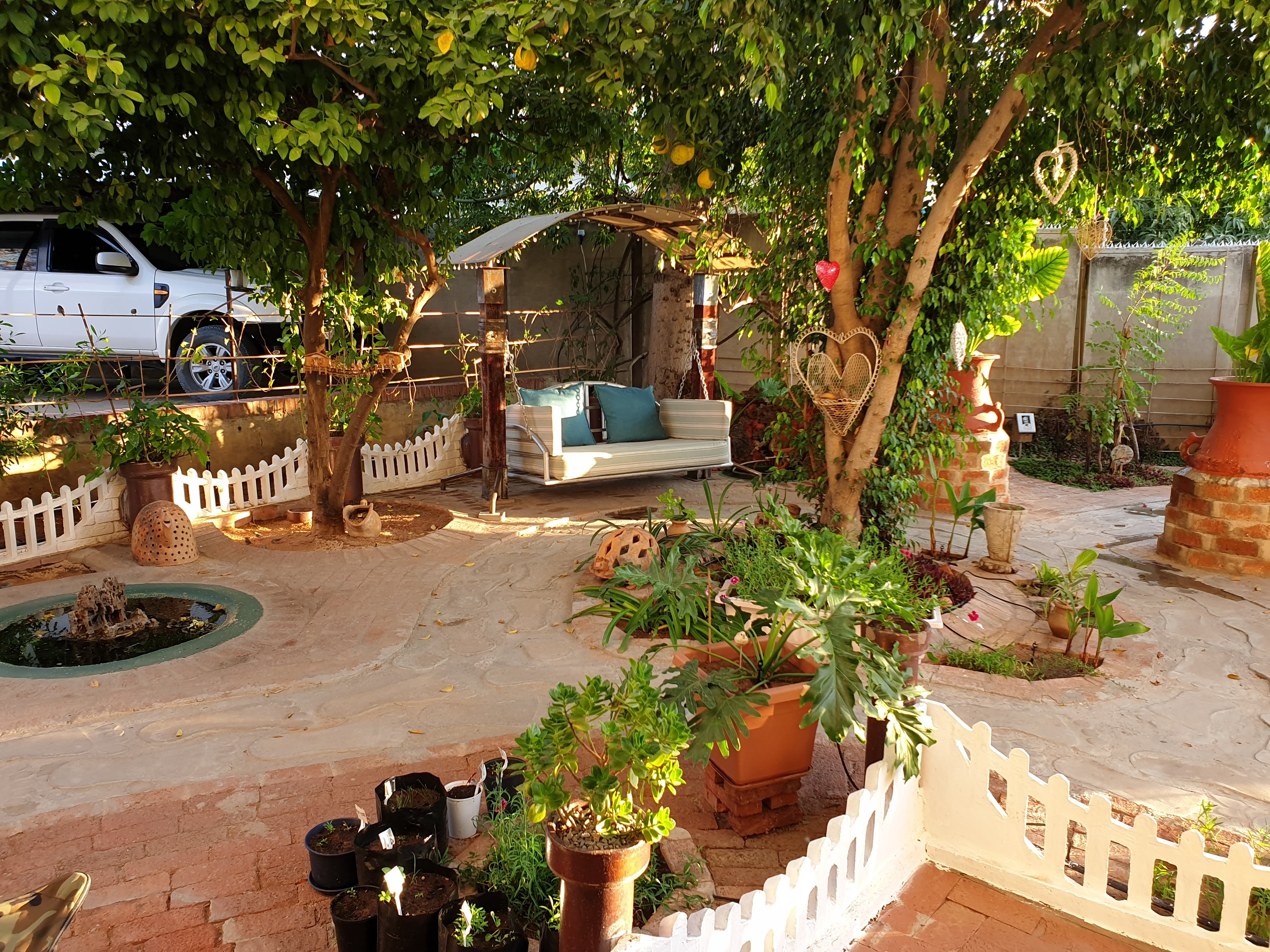 A lush green oasis embraces three sides of the house, with fruit-bearing trees, edible herbs, and abundant birdlife. The garden features cozy shaded seating areas, footpaths, and the sights and sounds of birds enjoying hanging feeders and a rock fountain in the background.