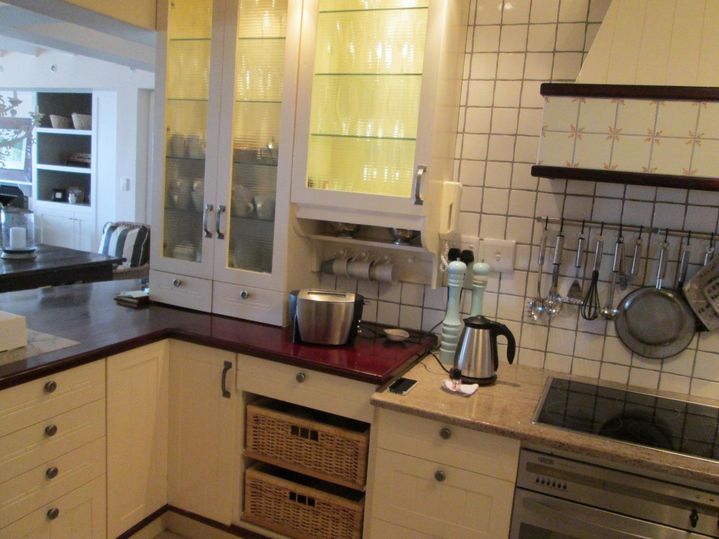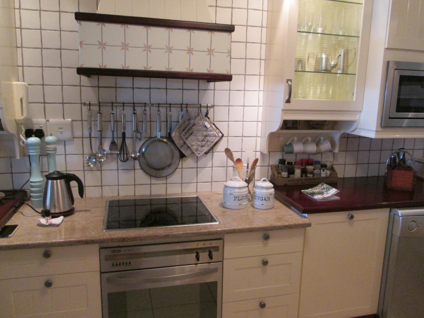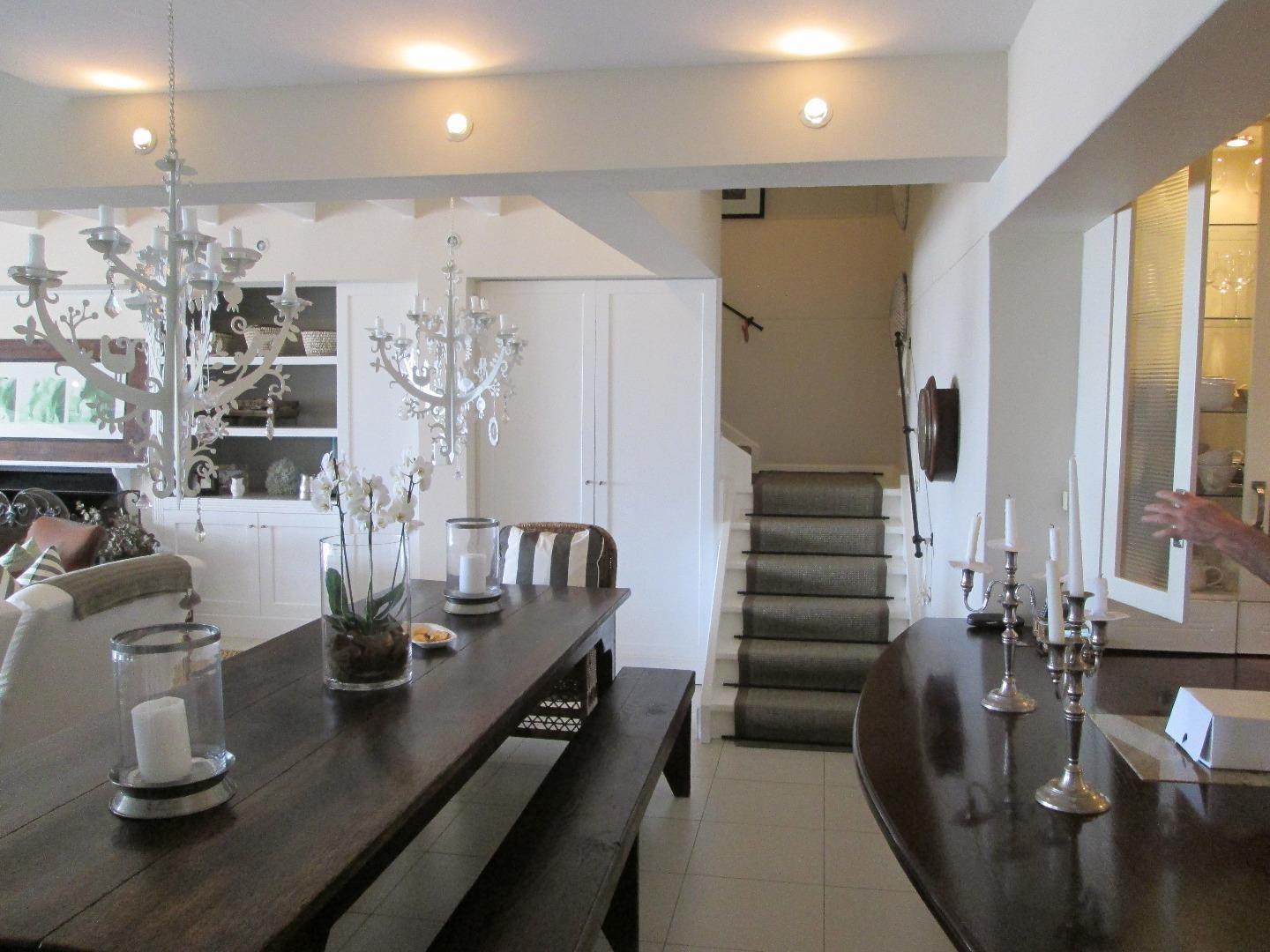 The open-plan kitchen is a chef's dream, featuring built-in cupboards and a modern stove. Adjacent to the kitchen, the spacious lounge and dining room provide an inviting atmosphere for entertaining guests or enjoying family time. A charming bar area is conveniently situated under the stairs, perfect for hosting gatherings.