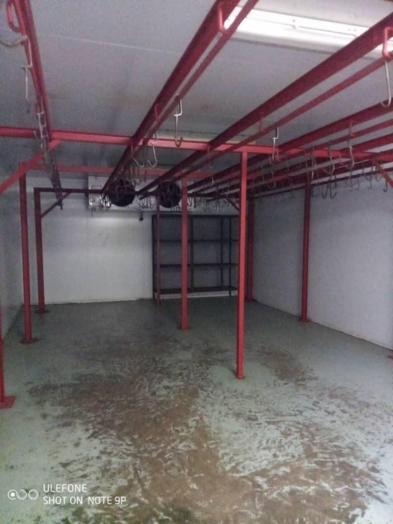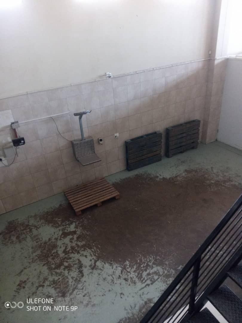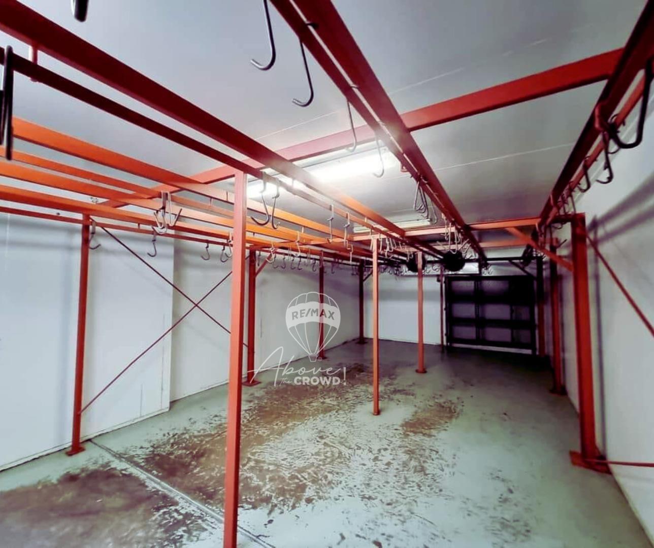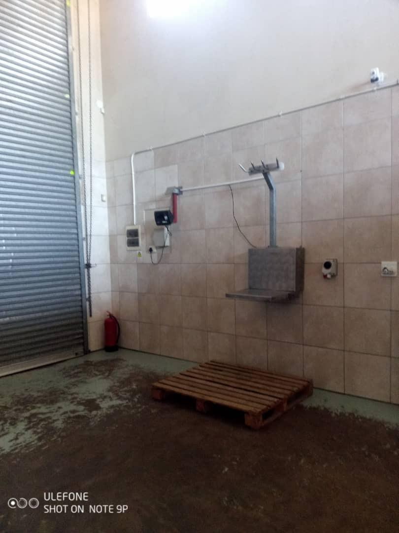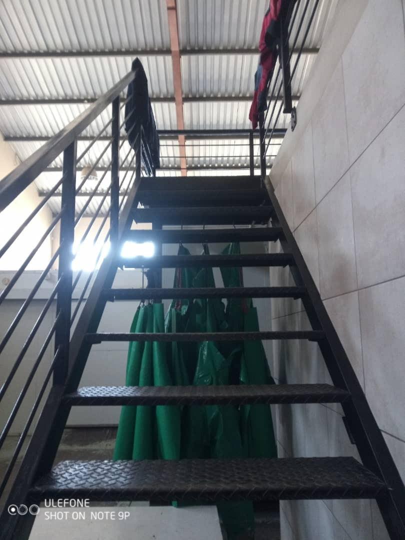 Inside, the property smartly combines industrial and administrative functionalities across multiple levels. The ground floor is designed for heavy-duty use, boasting durable tiled walls and a robust concrete or epoxy floor, making it ideal for warehousing, manufacturing, or processing activities. This area is equipped with a wall-mounted scale and visible electrical conduits, demonstrating its readiness for immediate operational use. A sturdy black metal staircase with diamond plate treads ensures safe and reliable access to the upper floor.