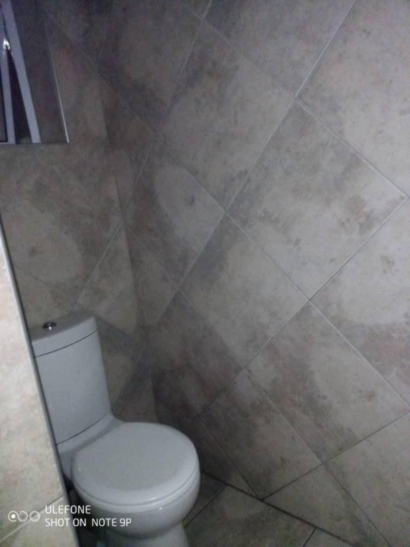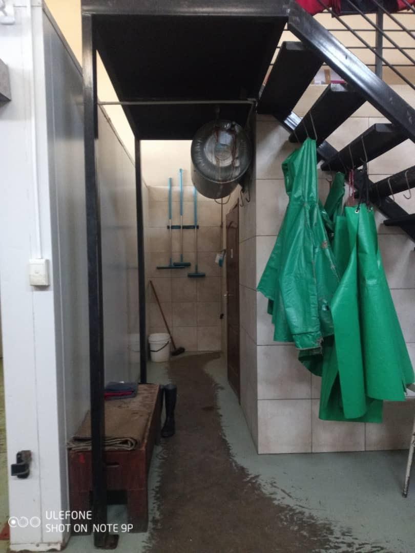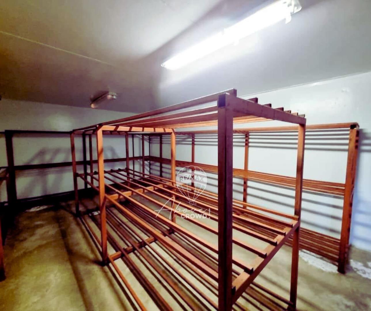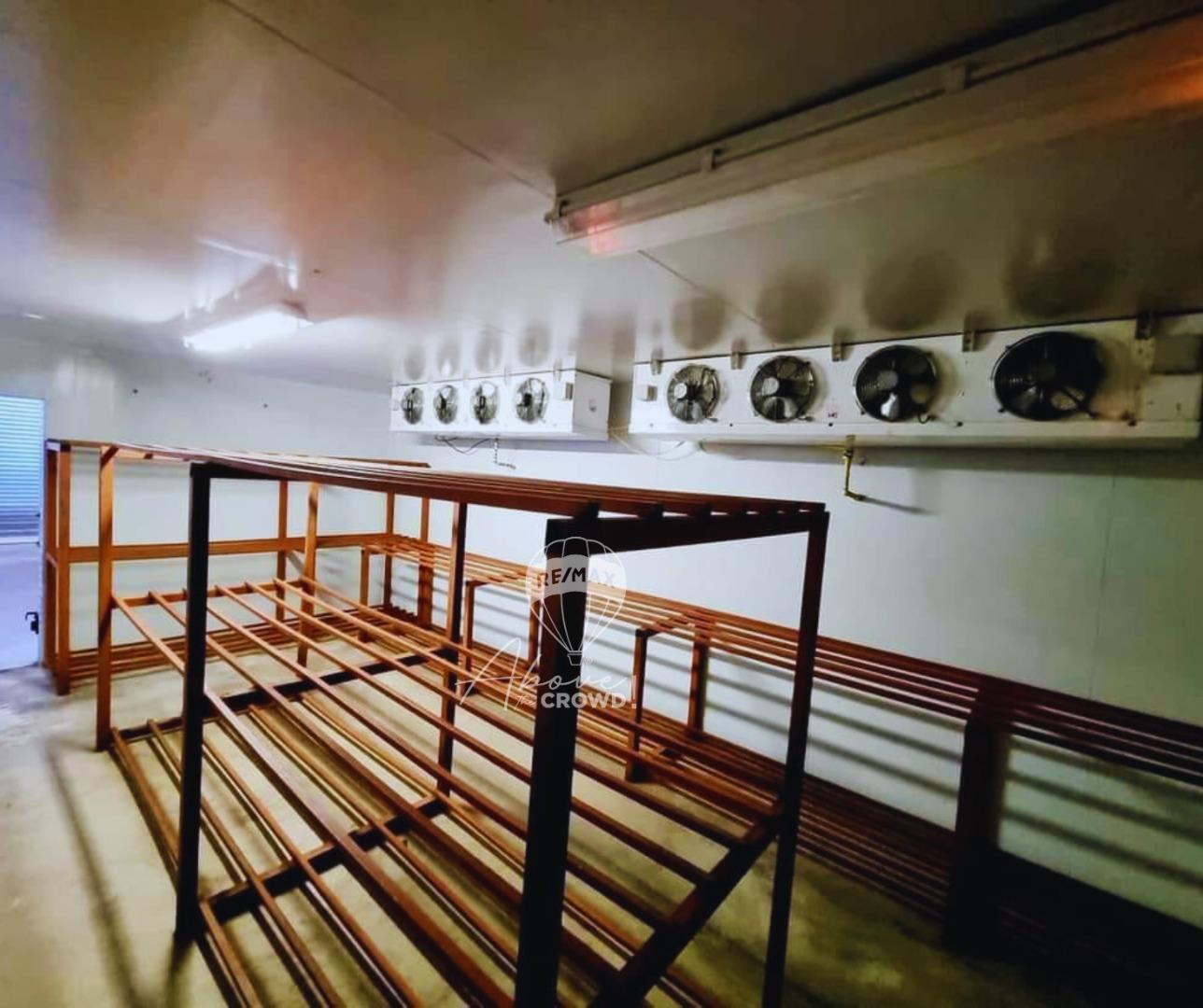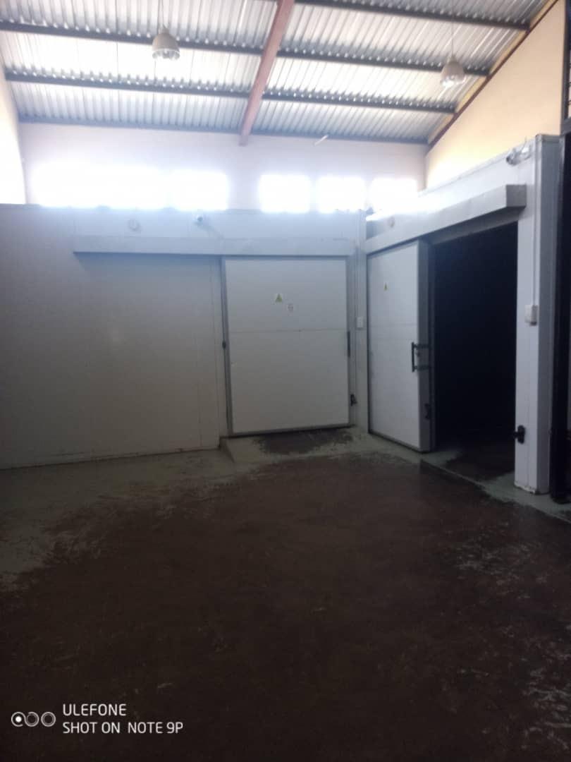 Inside, the property smartly combines industrial and administrative functionalities across multiple levels. The ground floor is designed for heavy-duty use, boasting durable tiled walls and a robust concrete or epoxy floor, making it ideal for warehousing, manufacturing, or processing activities. This area is equipped with a wall-mounted scale and visible electrical conduits, demonstrating its readiness for immediate operational use. A sturdy black metal staircase with diamond plate treads ensures safe and reliable access to the upper floor.