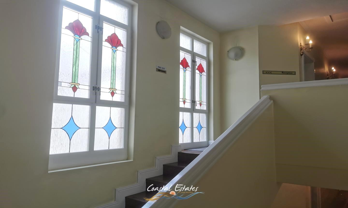 The hotel boasts a double-story structure with a basement, featuring plastered walls and fiber cement roof tiles. The copper roof cladding on the tower structure and cast iron gates add to its grandeur. Stained windows further enhance its historic charm.