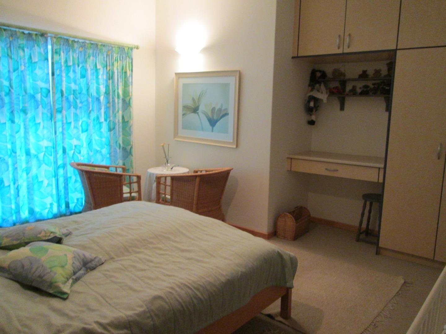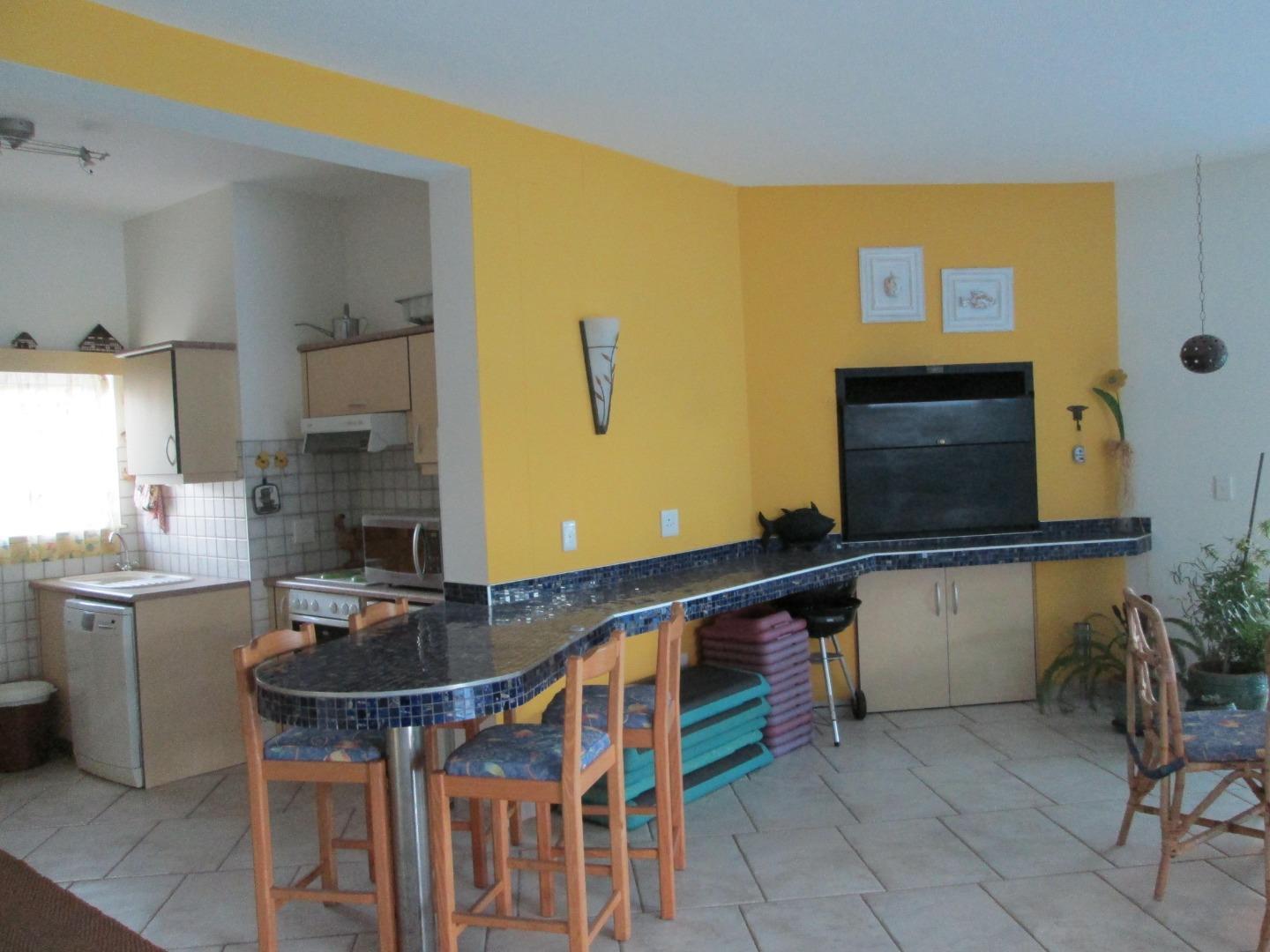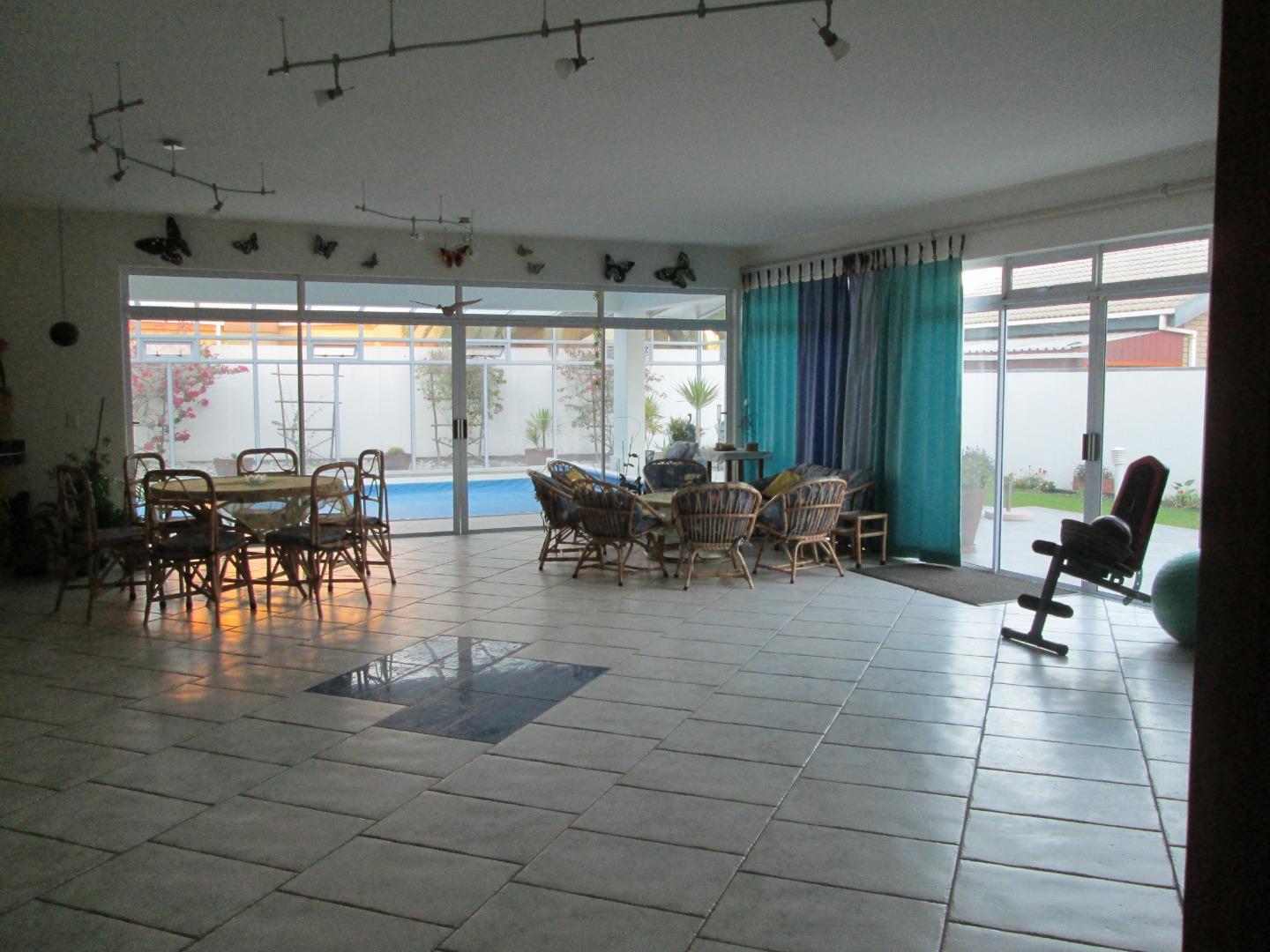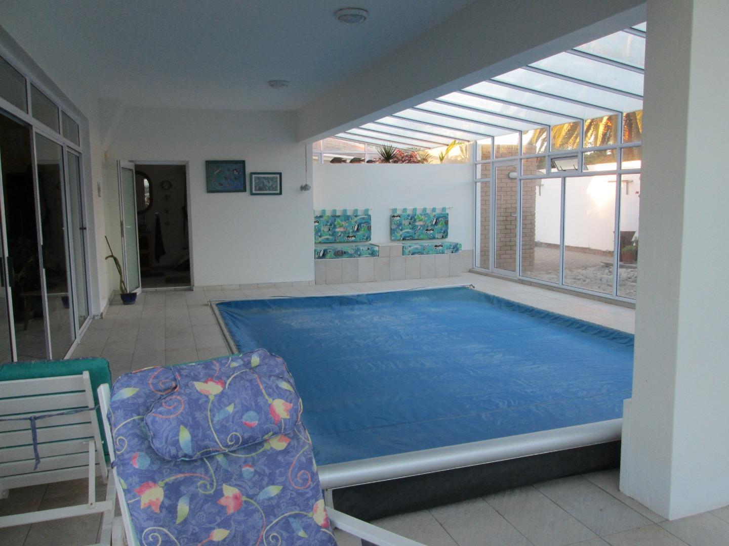 As you enter through the impressive front door, you are greeted by a foyer adorned by a tranquil water feature. The open layout ensures there are no hallways to interrupt the flow. This floor boasts two spacious bedrooms and a bathroom equipped with a shower. The open-plan entertainment area seamlessly connects the kitchen and indoor braai area, with sliding doors leading to the patio. Step outside to find a solar-heated, saltwater swimming pool under a glass roof, perfect for year-round enjoyment. Adjacent to the pool is a single-phase 6KW sauna and a shower with a toilet designed to relax both body and mind. Additionally, there is a lift shaft and motor room for your convenience.
