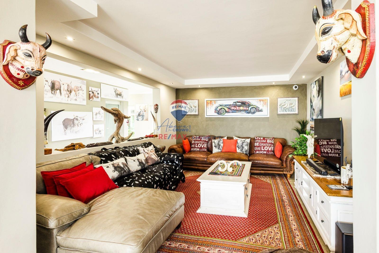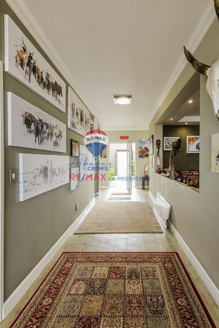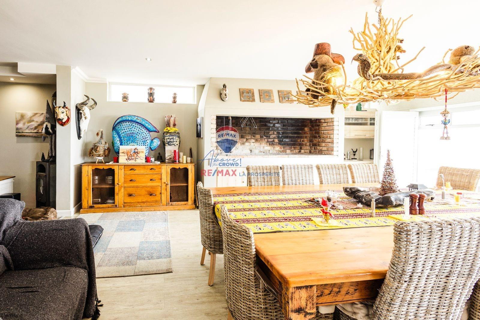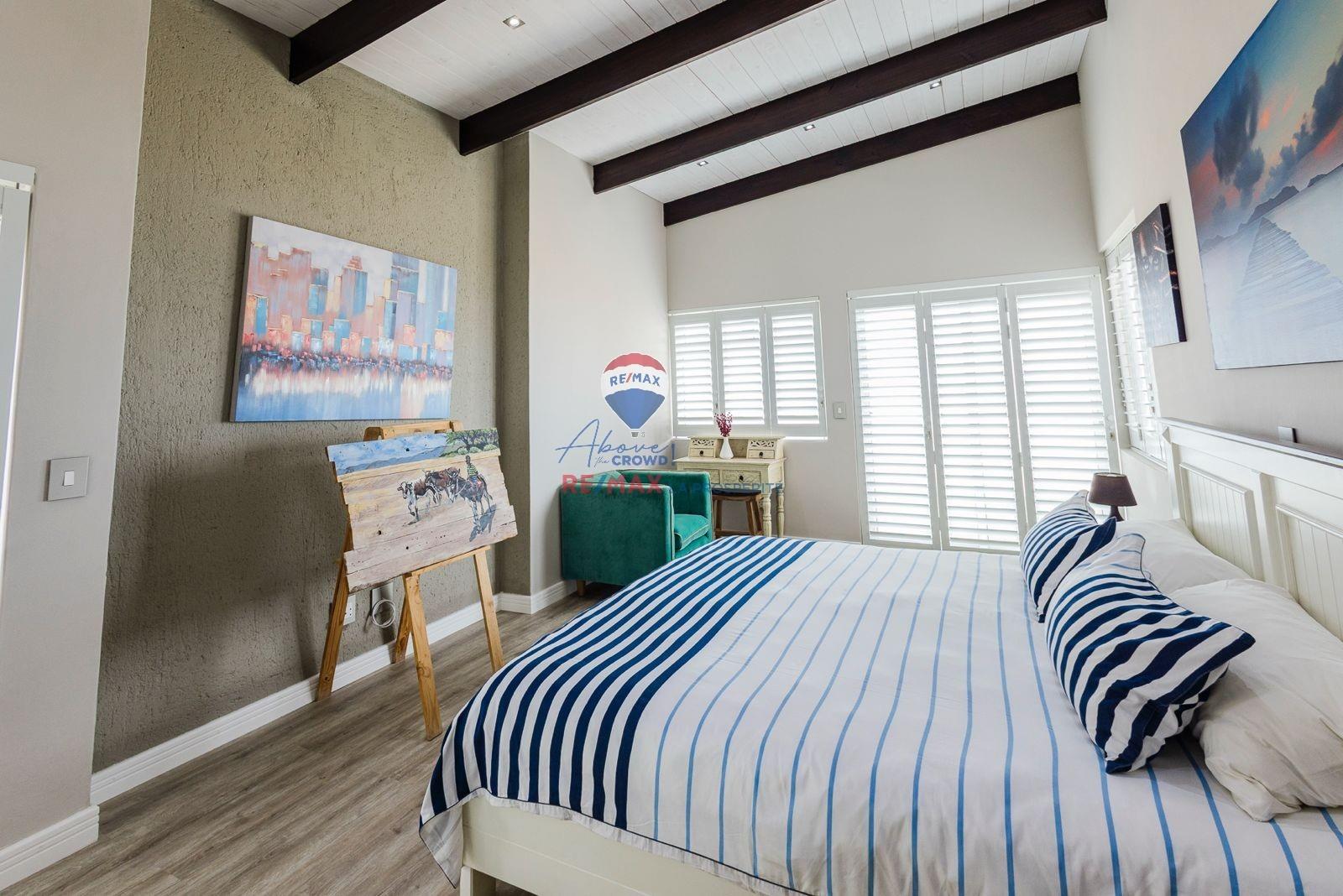 Discover this exceptional residential property located in the sought-after coastal area of Mile 4, Swakopmund, Namibia. Boasting a modern architectural style with a bright facade and lush tropical landscaping, the property presents an inviting kerb appeal, complemented by a distinctive carved wooden entrance and a large paved driveway leading to five spacious garages. Security cameras are visible, enhancing peace of mind.