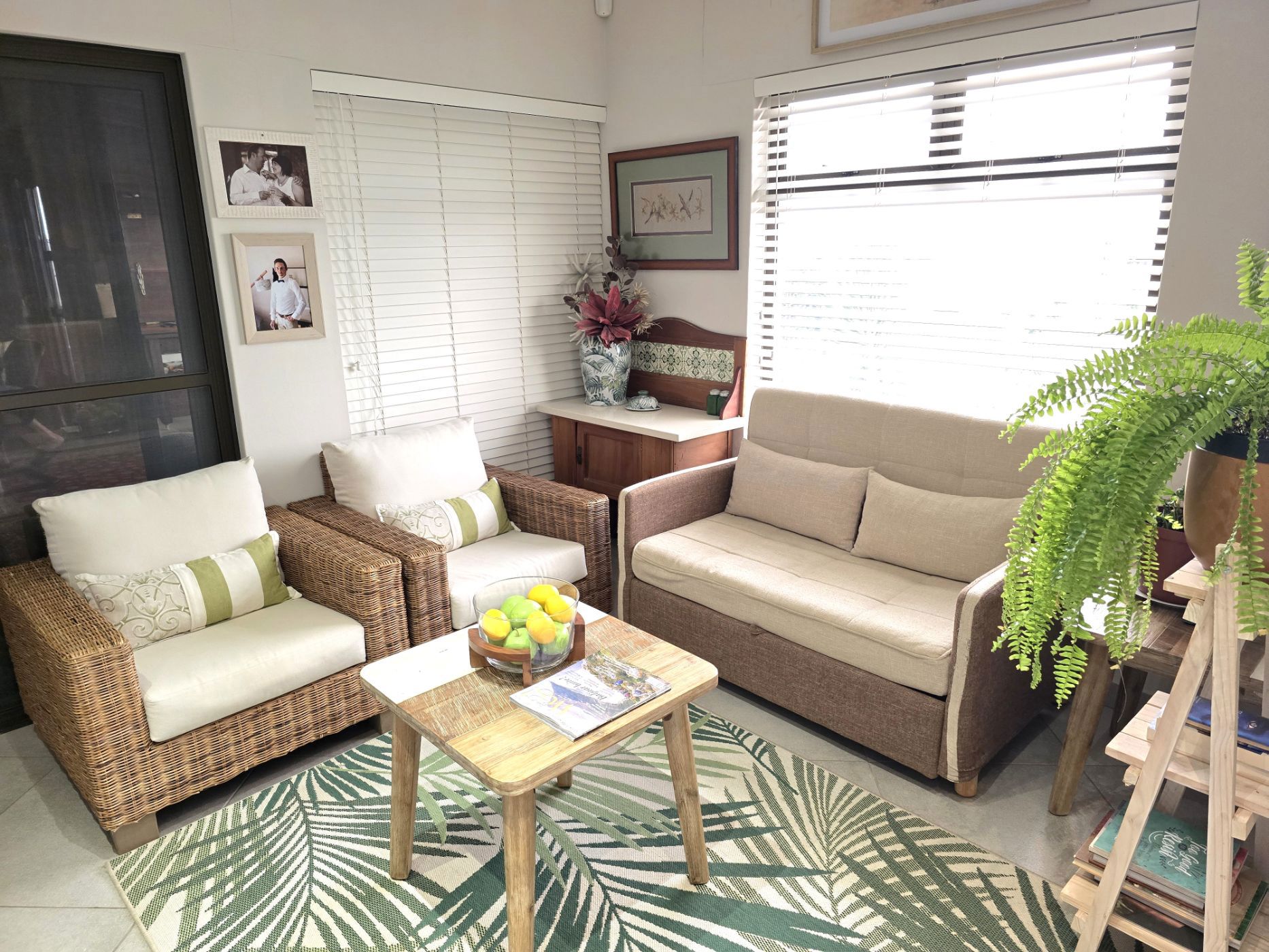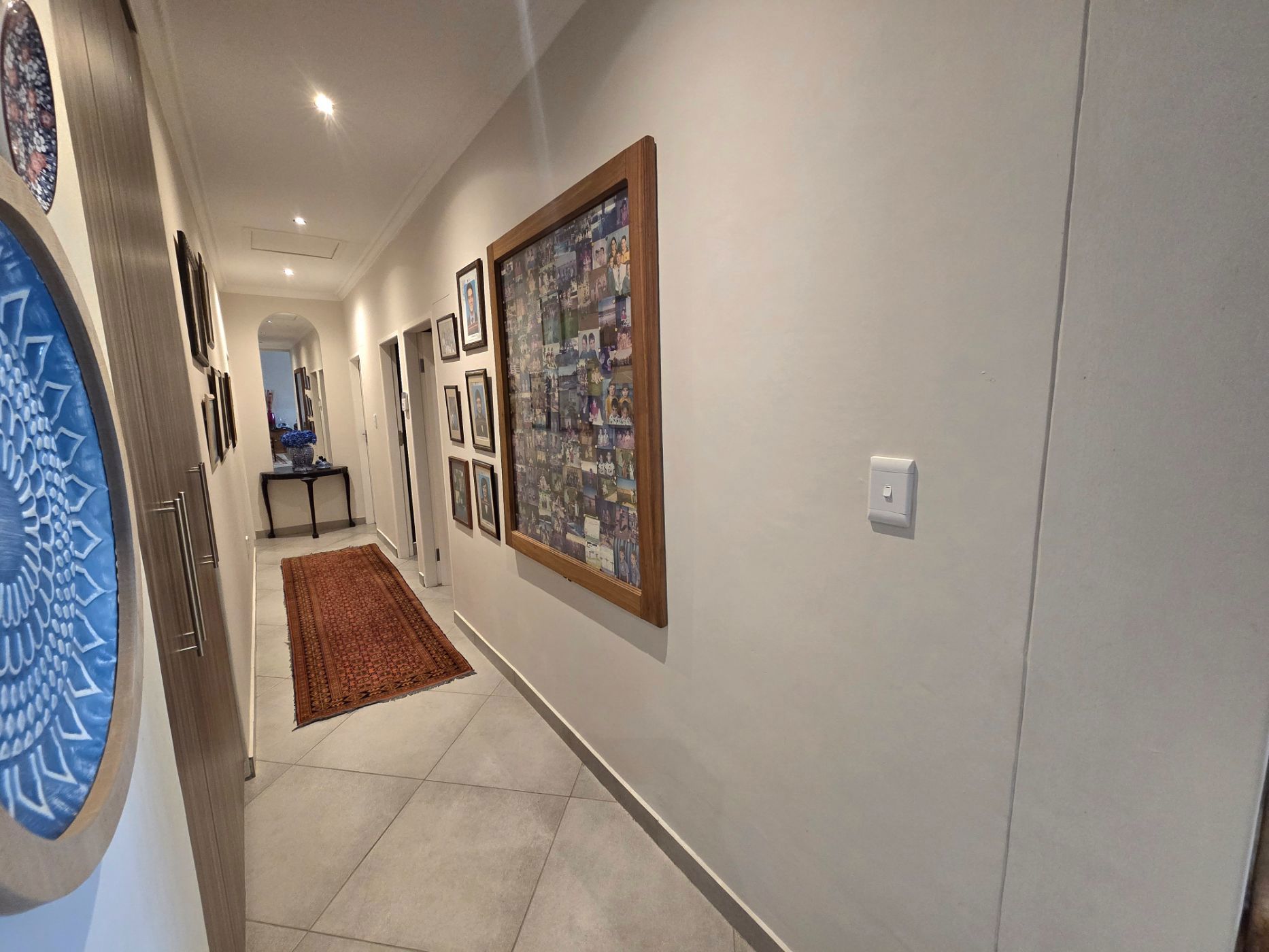 The home features three spacious bedrooms, two of which include full en-suite bathrooms. A third bathroom with a shower conveniently serves guests and family alike. Elegant bamboo blinds throughout the home lend a touch of natural warmth.