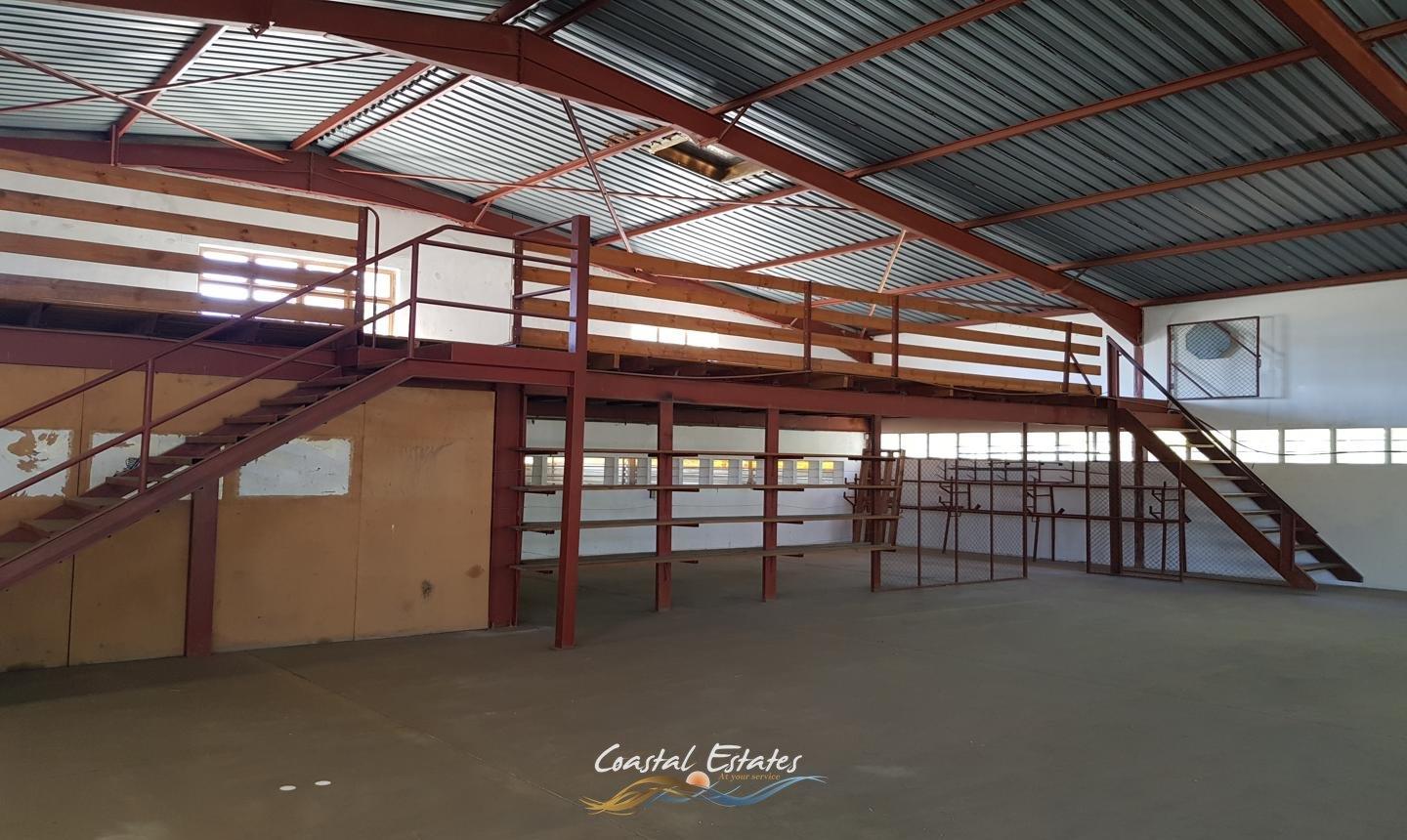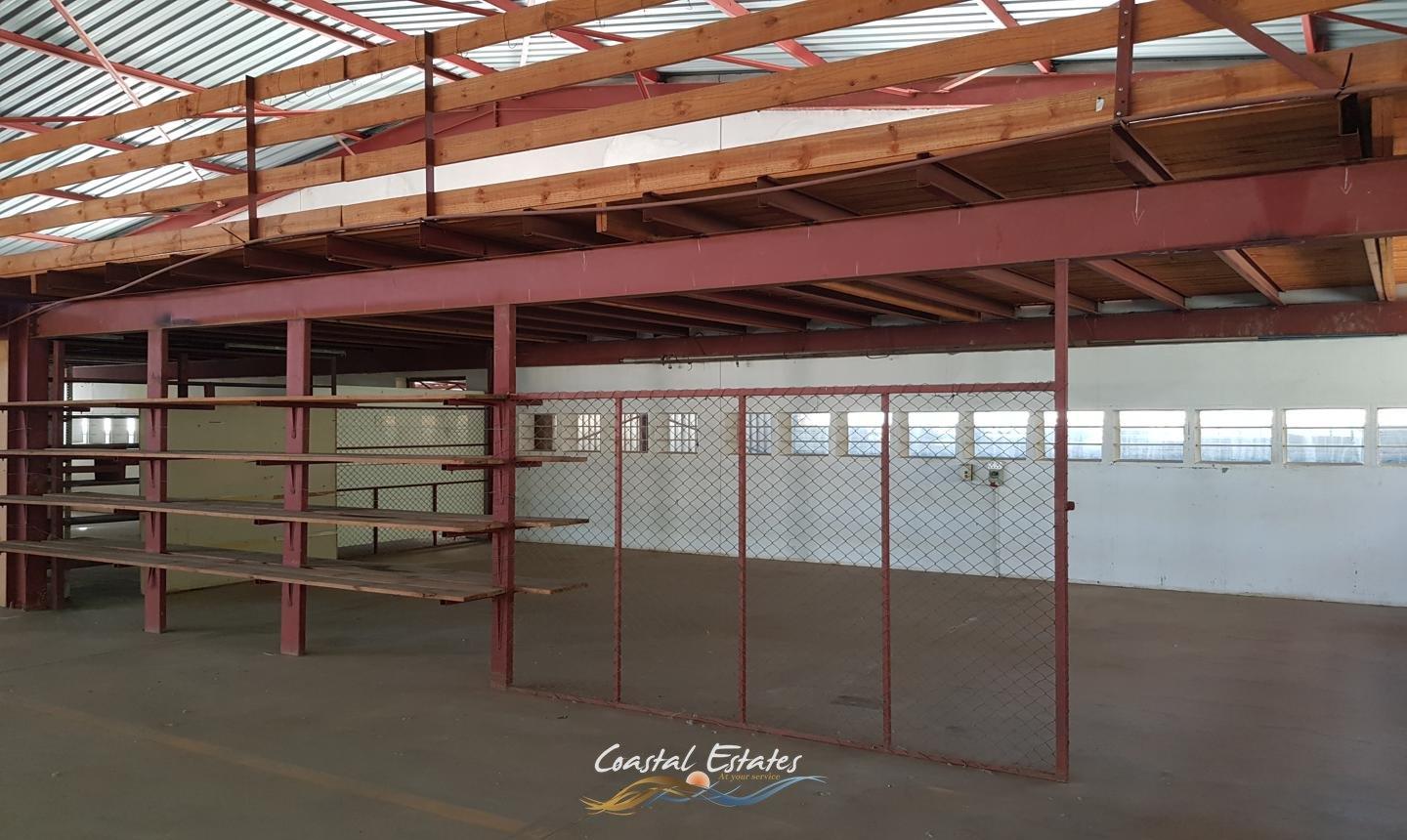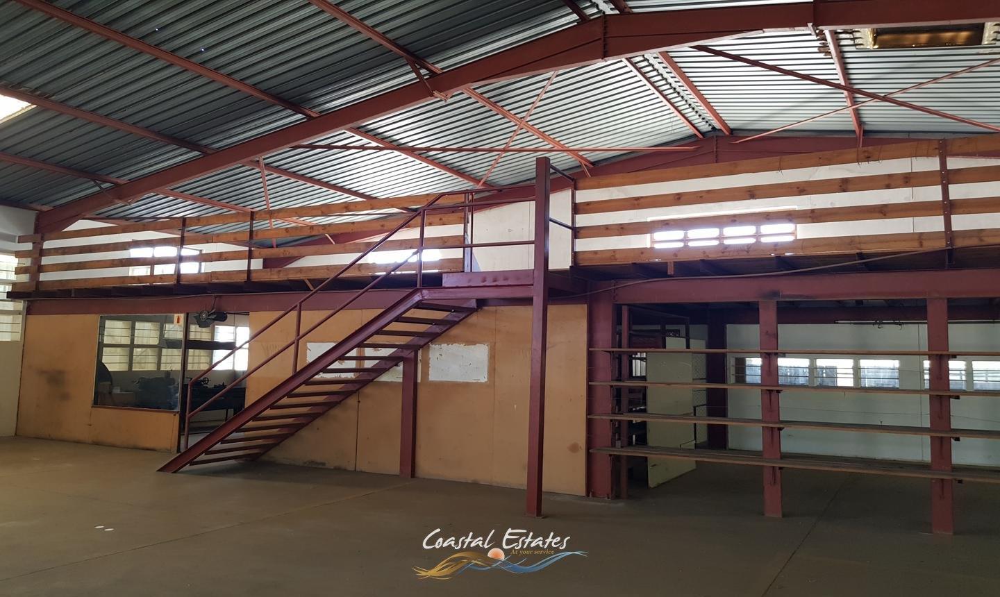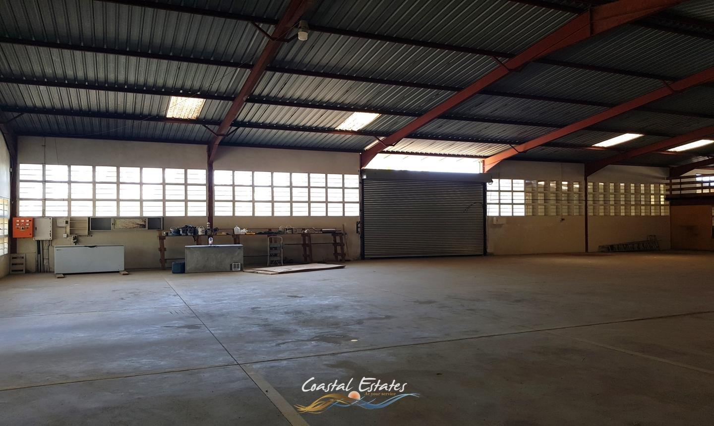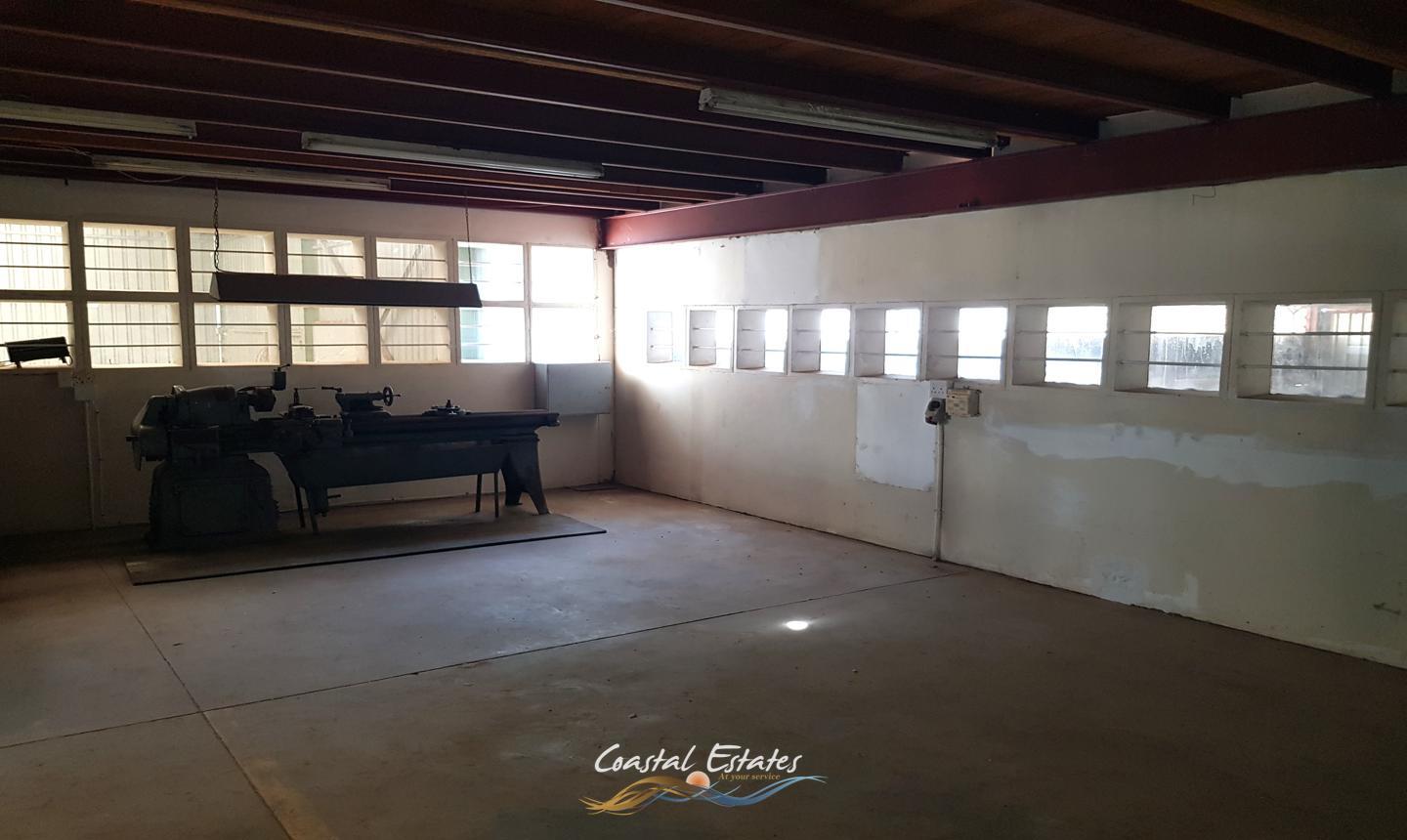 A substantial workshop of 634 m2 featuring a mezzanine floor of 115 m2 and an attached shed of 222 m2, complete with large roll-up doors and ample natural light
