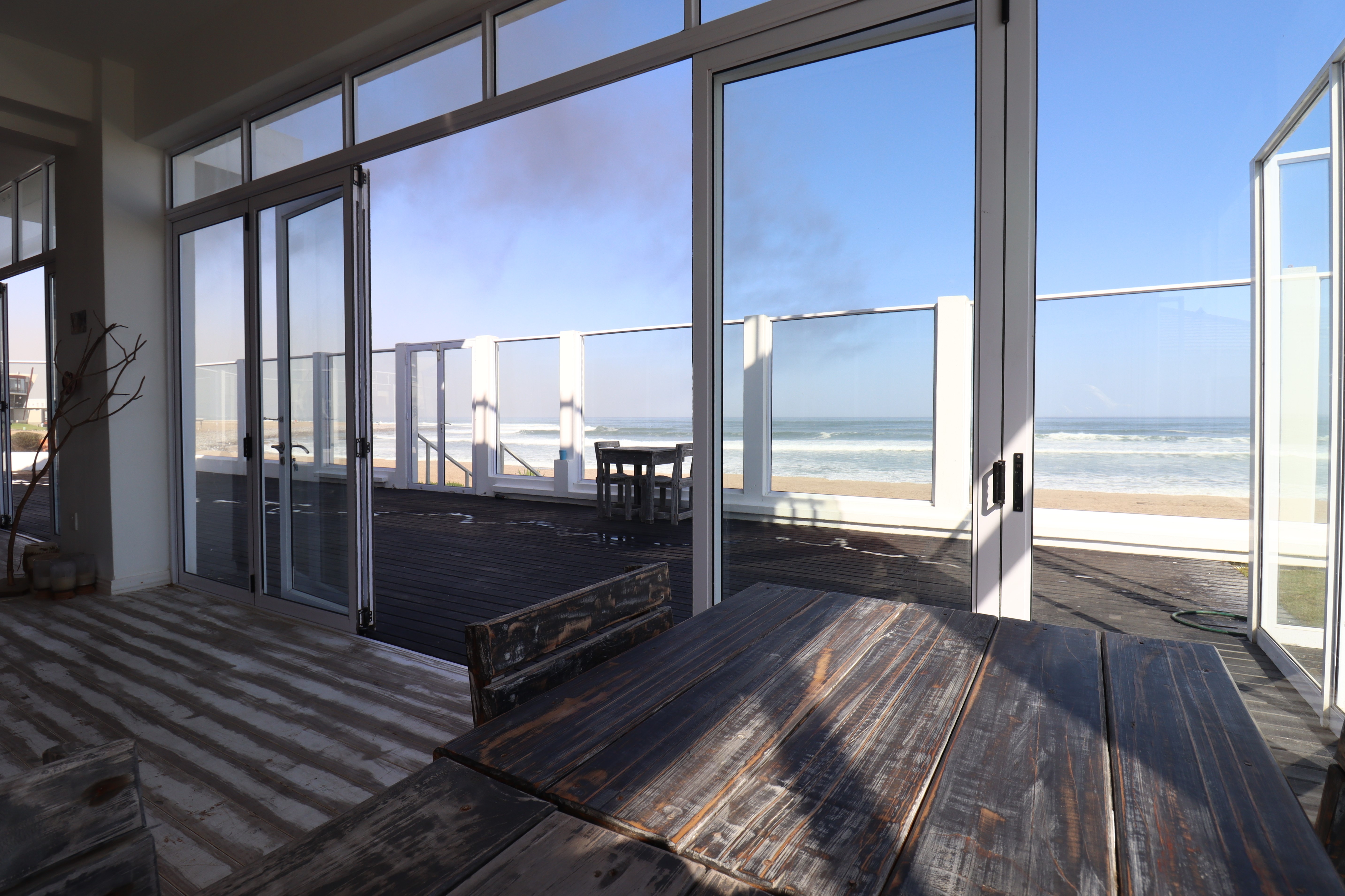 The expansive beachfront deck is ideal for sunny lunches, morning coffee, and sunset cocktails, providing an inviting beachside experience.