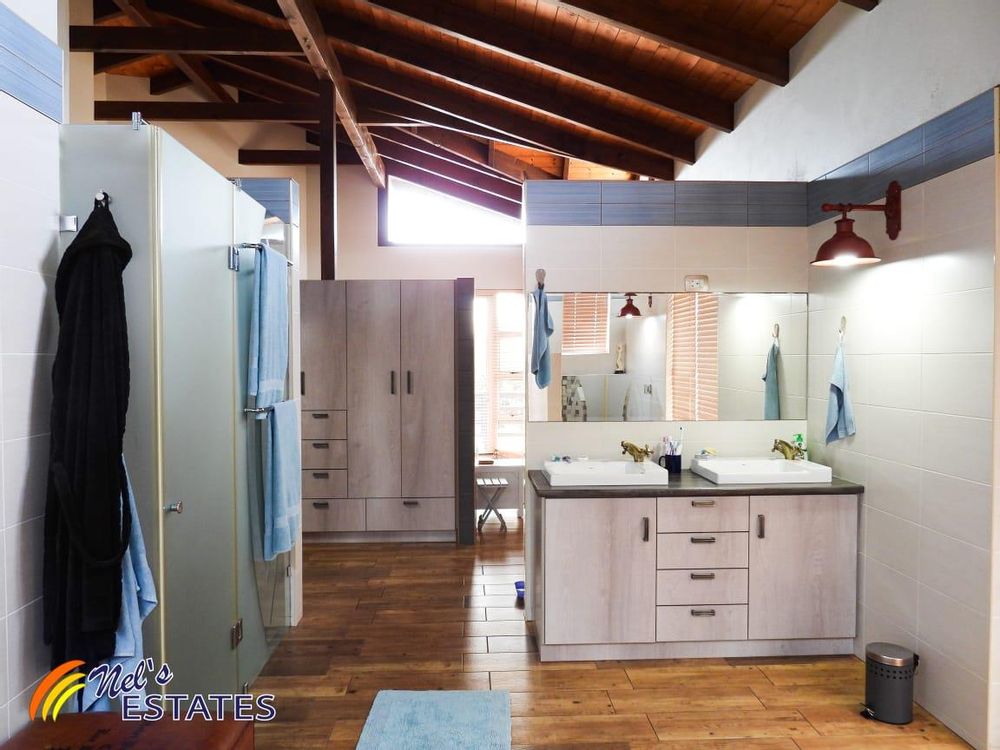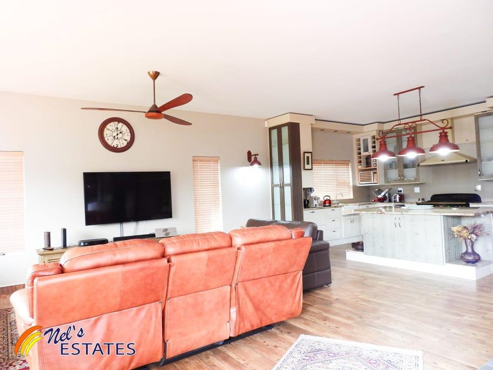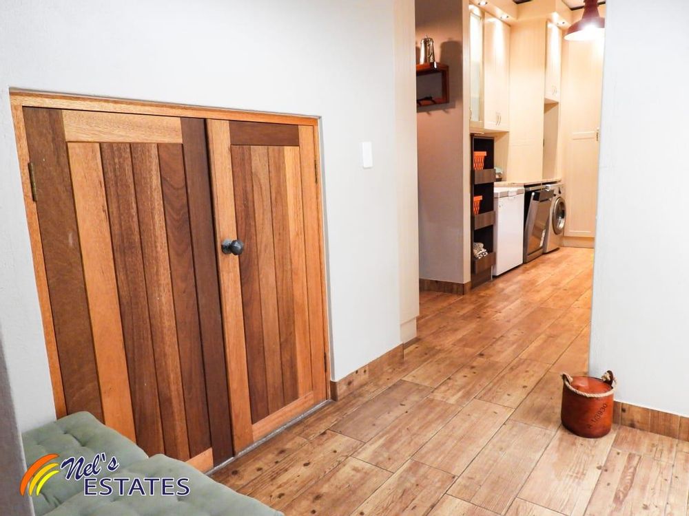 Spread across three levels, this home offers a well-designed layout. The ground floor features a reception patio deck, a spacious living area divided by a Camino, creating separate dining and lounge areas. The kitchen is beautifully appointed with granite tops, soft close cupboards, and a breakfast nook. A large scullery/laundry room and under stair storage provide additional convenience. There is also a guest loo and three garages outside, along with a storage room.