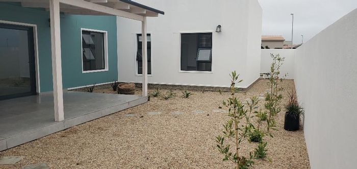 Coastal calm in Swakopmund with private single-story living, sunny courtyard and covered patio — enjoy an indoor BBQ kitchen island, three-bed, two-bath layout with double garage.