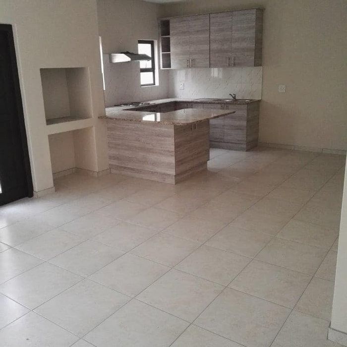 2-bedroom townhouse with open plan kitchen, indoor braai area, yard, and garage, perfect for outdoor activities and relaxation.