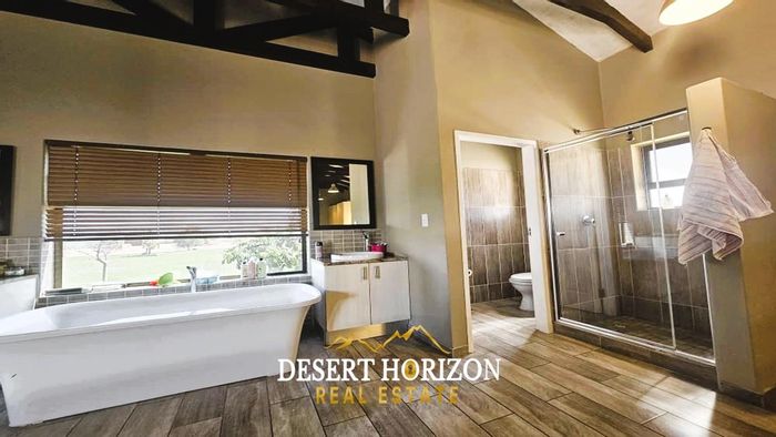 Embrace expansive rural living at Swakop River Plots with riverine calm, solar-powered self-sufficiency and a massive 370sqm chicken coop — two-bedroom main house, two baths, double garage.