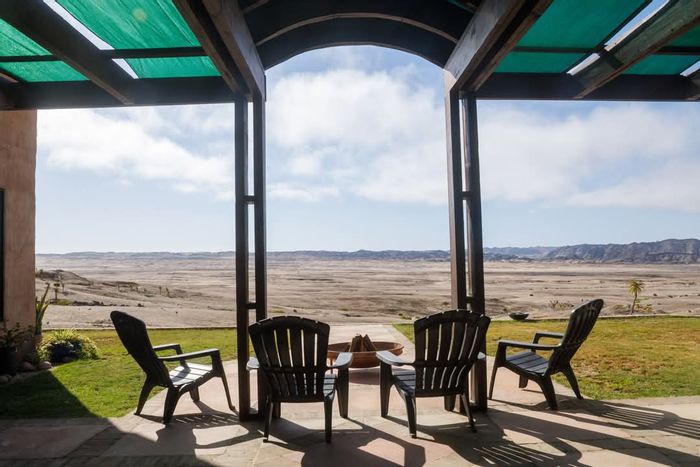 Live serene small-holding life 15 km from Swakopmund, with Moon Valley views from a loft, sunlit open-plan kitchen with movable island, fireplace, and four bedrooms.